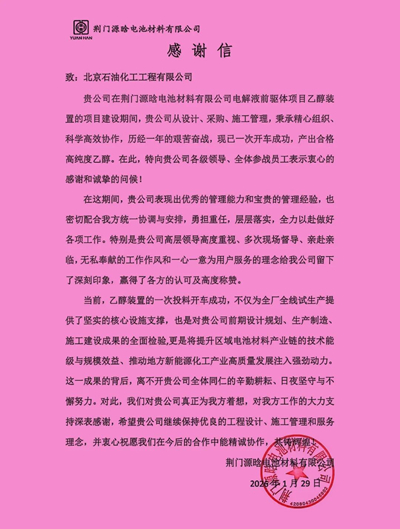 1月26日,北京石油化工工程有限公司(简称:北油工程)总承包的荆门源晗乙醇装置一次性开车成功,顺利产出合格高纯度乙醇,标志着该项目建设任务圆满收官、实现阶段性重大突破。荆门源晗特向北油工程发来感谢信,对公司各级领导及项目团队在装置建设期间的倾力支持、卓越管理和辛勤付出,致以衷心感谢与诚挚问候。